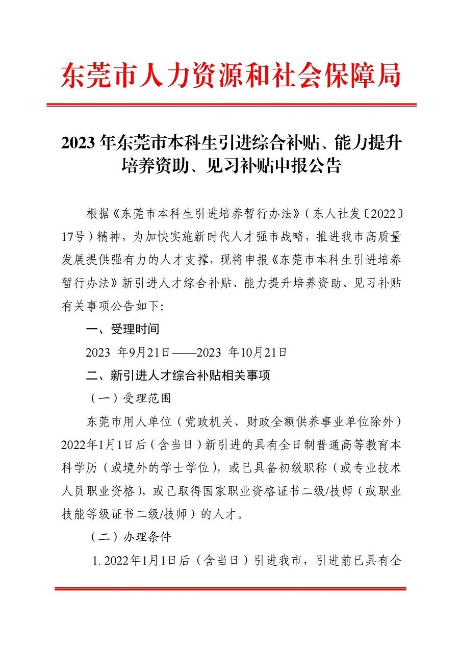 2023年東莞市本科生引進(jìn)綜合補(bǔ)貼、能力提升培養(yǎng)資助、見習(xí)補(bǔ)貼申報公告